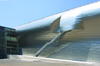 The facility is a piece of sculpture. Because of the building's shape, the team wanted its exterior to have a satin sheen that would pick up the qualities of landscape and sky and change with the light conditions and seasons. The sliver is made of prefabricated steel hoops enclosed with metal decking and then clad with flat-lock, stainless steel shingles. The thin shingles warp in two directions, stiffening them and minimizing denting. The shingles absorb some heat from the sun, but the form and shape of the shingles allow it to radiate the heat as the solar gain moves quickly to the edge of the material and dissipates.