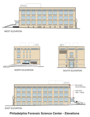 The rigorous program includes a firearms unit; a crime-scene unit for gathering evidence; chemistry laboratories for drug analysis; and criminalistics and DNA laboratories for hair, fiber, and blood analysis. The Forensics Science Center handles all crime-scene evidence for the City of Philadelphia, with the exception of evidence from homicides. The Center is housed in a former K-12 school building on a site that had been abandoned for many years. It is a concrete-frame building with brick infill, originally constructed in 1929.