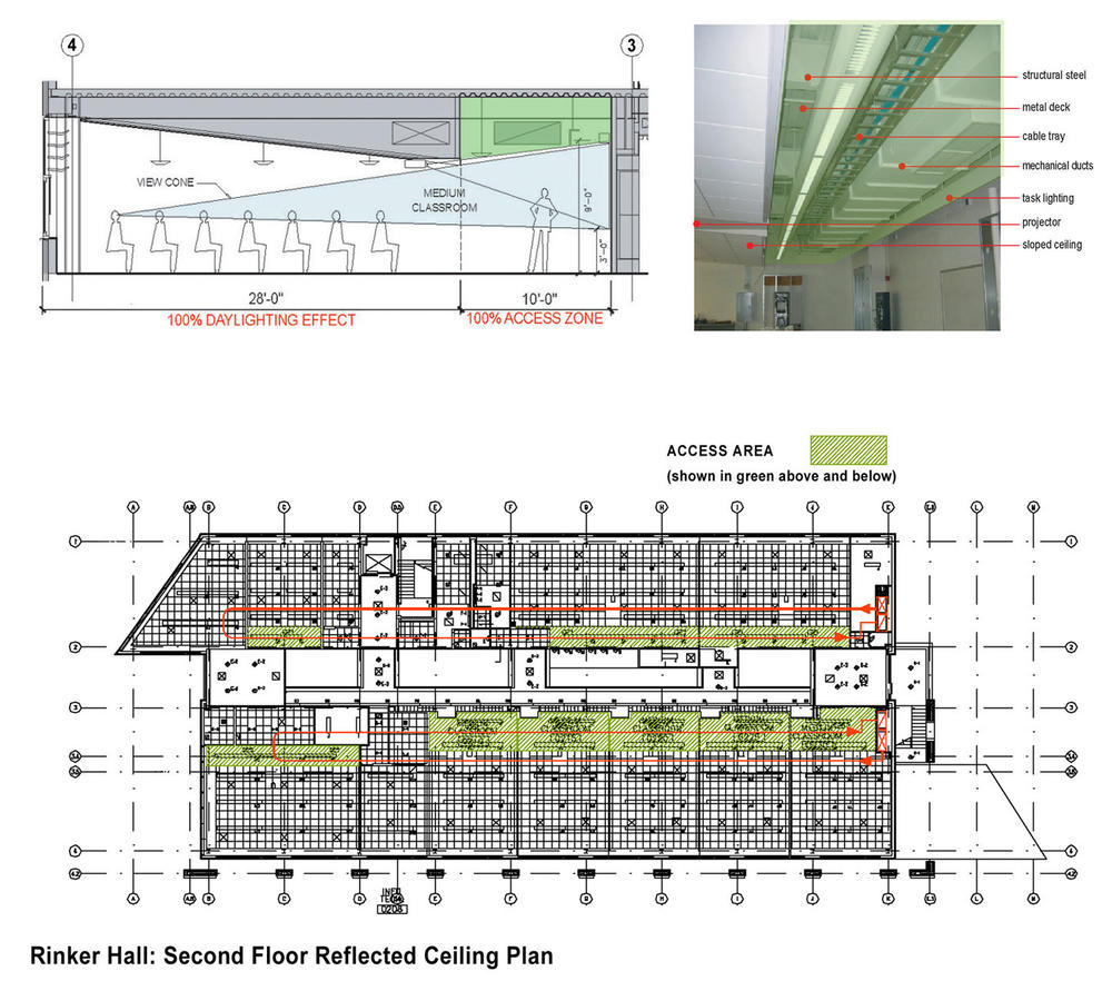 Rinker Hall is oriented on a pure north-south axis, demonstrating the ability to utilize low-angle light for daylighting. Egress paths from all classrooms at all levels are daylit, allowing for emergency exit during a daytime power failure.