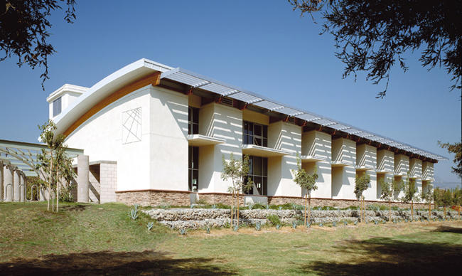 The building shell is high-mass concrete masonry units (CMU) with exterior insulation to facilitate night venting – the local climate includes a significant diurnal temperature variation. The building is well insulated and roofed with Energy Star-compliant, high-emissivity roofing. Windows are interlocked with mechanical systems to allow natural ventilation. Window location and interior volume shape maximize ventilation. HVAC systems with variable-speed drives and pumps use non-HCFC refrigerants. Temperature and humidity are controlled within ASHRAE 55 standards.