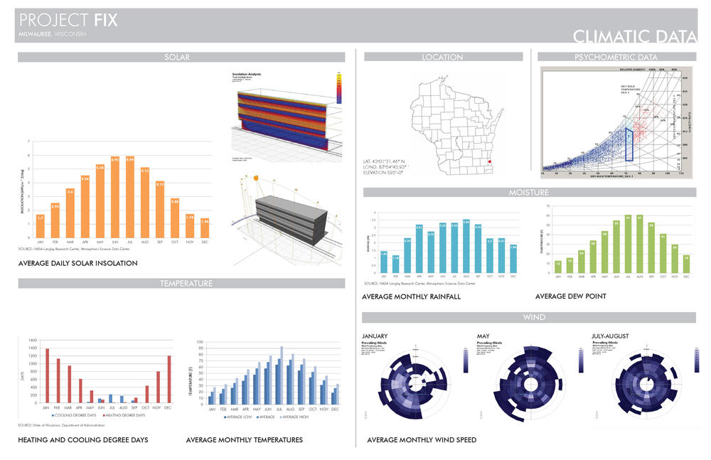 Milwaukee has a continental climate with large temperature and humidity swings throughout the year. These swings necessitate the use of heating and cooling systems that will condition the spaces during the extreme winter and summer months. However, the team wanted to minimize the use of these systems during the swing months of April, May, September and October. Passive strategies, such as the south-facing windows with sun screens that maximize solar heat gain during cooler months, and operable windows that let cool fresh air into the building, allow the users to greatly decrease and even effectively “turn off” the heating and cooling systems during these swing months.