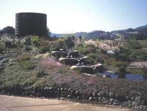 The building's curved back wall is constructed of rice-straw bales covered with "gunearth." The locally produced, glue-lam roof structure is made from salvaged fir and the roofing membrane is made from recycled car tires. The floor slab and columns contain fly-ash in place of some energy-intensive Portland cement. A solar-powered pump moves water through the site for irrigation and summer cooling. Constructed wetlands capture rainwater. Native and drought-tolerant plantings attract pollinating insects, birds, and animals, and provide a beautiful and educational environment for human visitors.