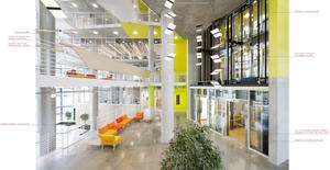 Teaching spaces with higher internal heat gains utilize a displacement ventilation system delivered at floor level. Ventilation air is transferred from perimeter spaces to the atrium via customized air transfer devices that maintain acoustical and fire separation between diverse program spaces. Operable windows are provided in regularly occupied spaces, allowing users to have direct control of their environment. Occupants have local control of operable windows in all office, teaching and library spaces, and are notified of favorable outdoor conditions by means of a green indicator light that communicates appropriate times to open a window. Atrium operable windows are fully controlled by the building automation system based on the quality of outdoor conditions. Atrium smoke exhaust fans are activated at low speed in natural ventilation mode to guarantee good cross ventilation through all spaces, and acoustically protected and fire-protected transfer openings are provided from perimeter spaces to the atrium.