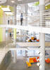 The concrete structure’s thermal mass is leveraged to reduce heating and cooling loads, and create a stable indoor climate even during extreme temperatures. Plastic tubing embedded into slabs circulates cold or hot water depending on needs. Materials were selected based on regional availability, potentially hazardous components and recycled content. The project achieved 46 percent regional materials, 26 percent recycled content, and 90 percent certified wood in accordance with LEED guidelines. Fly ash used in the concrete reduced carbon dioxide emissions by 1.3 million pounds. Sustainable interior finish materials include linoleum, bamboo, FSC-certified wood, recycled-content concrete, and Green Label Plus carpeting.