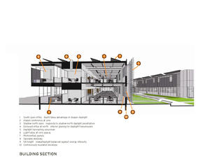 An Ideal building footprint depth is employed to deliver daylighting throughout. Louvered sunscreens, with horizontal blades and vertical fabric panels at the south elevation of each wing, reflect daylight deeply during all seasons, block unwanted summertime heat gain and allow passive winter heating. The parabolic profile reflects high elevation summer sun off of the curved portion and low winter sun angles off of the flat portion of the louvers. Zinc-clad office enclosures cantilever from the north elevations, taking advantage of diffuse northern light.