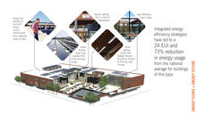 Honoring the history of the building, the design team left the existing double wythe brick walls mostly intact but improved thermal insulation through the addition of R20 rigid roof insulation. The roof was upgraded to a reflective TPO cool roof to mitigate heat gain. Though the original steel frames surrounding the clerestory windows would only accept 1/4-inch laminated safety glass, the new punched windows and curtain wall feature one-inch-thick Solar Band 70 XL coated high-performance glass. Steel window box shades surround the windows along the east and west facades. To mitigate solar gain, the new shades are extruded about a foot on the east side of the building, and about two feet on the west. The clerestories and courtyard curtain wall are equipped with translucent, automated shades that control glare without obscuring views and also abide by the astronomical clock. These combined shading strategies have reduced the amount of time that requires active conditioning by 18.5% per year. The courtyard curtain wall illuminates interiors but is shaded by the preexisting south façade, preventing direct glare. A 65 kW photovoltaic rooftop array generates approximately 46% of the energy needed for building operations.