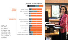 Both quantitative and qualitative feedback is used to continuously optimize the building. Building performance is tracked through CO2 monitors, as well as dataloggers that track temperature, relative humidity, and light levels. A year and a half after building occupancy, a post-occupancy survey was conducted with plans to repeat the survey annually. The survey considered the overall building experience such as thermal comfort, acoustical comfort, workstation ergonomics, bike accessibility, amenities, and safety. On average, the results showed users were 80% satisfied. The survey led to new initiatives to increase user well-being, like a bike to work program, the option for standing work desks, and improvement of bathroom amenities. Prior to construction, potential concerns about acoustics had been expressed due to the project’s open spaces and hard surfaces. However, the acoustical qualities were actually quite successful, which was confirmed through the occupancy survey.