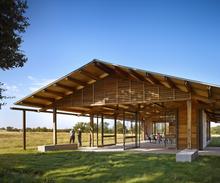 The sliding, wood slat doors also have operable panels. - Photo Credit: Casey DunnThe client’s initial goals were clear: design a comfortable meeting and education facility to shelter those that come to learn how the Dixon Water Foundation uses livestock as a tool to restore our native prairies and create healthier watersheds. The facility was to have no active heating or cooling and be designed to adapt according to the weather conditions on any particular day. This led to a building that could fold and unfold based on temperature and wind conditions. A building that embraced the simplicity and serenity of the North Texas prairie while serving as a lens through which the land is better understood and appreciated.