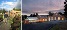 Climate analysis (left) influenced the building orientation which shelters the entry (right) from previling winds - Photo Credit: Opsis ArchitectureThe project is located in a scenic area near the Columbia River Gorge, a site that receives moderate annual rainfall, good solar exposure and significant seasonal temperature swings. It is fairly rural in character, surrounded by farms, orchards, and Hood River’s downtown Main Street to the northeast.
