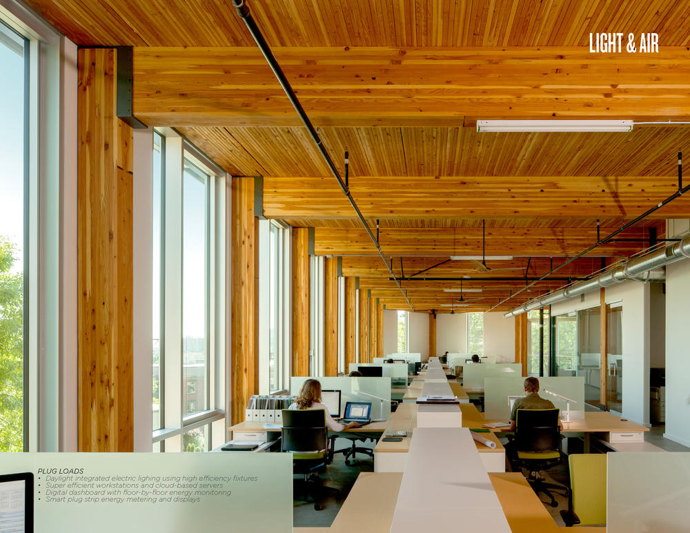 Other elements make the building flexible and durable. Heavy timber is inherently fireproof by virtue of its size and slow-burning nature, avoiding the need for applied fireproofing. The exposed timber frame is entirely contained within the thermal envelope, eliminating moisture potential issues over the long term. Steel support structure for the photovoltaic array is adjustable as future panel technology and efficiency improves. Open floor plates accommodate changing tenant needs.