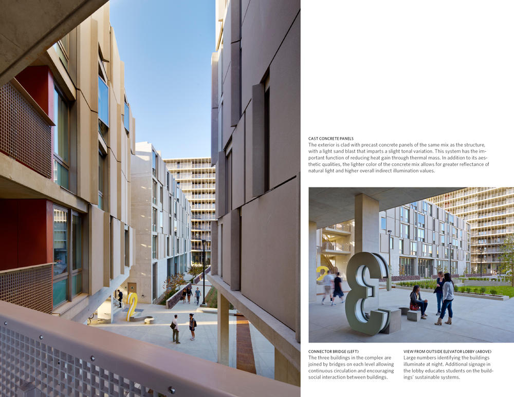Three apartment buildings are arranged in a C-shape around a courtyard that creates a new social zone and unites it with the existing 1960s Fleet Residences to the east. They adopt elements from the classic campus buildings; exterior walkways, repetitive sun control elements, and a warm color palette, but are firmly rooted in a 21st century aesthetic that unites form and performance. Great lengths were taken to construct the buildings with high quality, cast-in-place white concrete to visually tie them to the existing architecture.