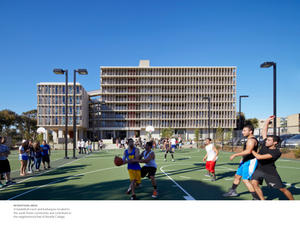 The location offers remarkable views to residents as well as access to refreshing onshore breezes. The apartments are situated to provide expansive views of the ocean and mountains from all interior spaces, and from exterior walkways and the large roof terrace, which have become popular gathering spaces. The buildings and landscape promote the active use of exterior spaces, encouraging interaction among students with outdoor circulation that leads to chance encounters, convenient spaces for individual and group activity, and spaces conducive to congregating.